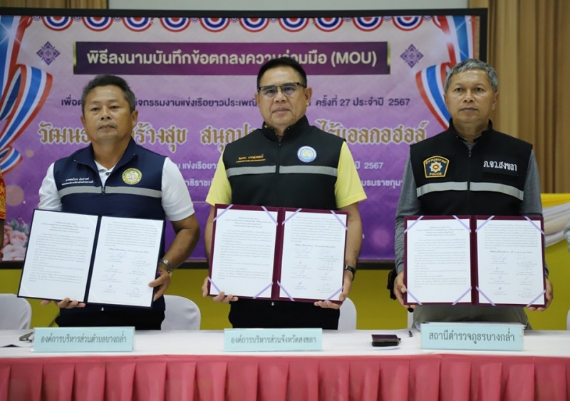 อบจ.สงขลา ร่วมลงนาม MOU การแข่งขันกีฬาเรือยาวประเพณีจังหวัดสงขลา ครั้งที่ 27 ประจำปี 2567 "วัฒนธรรมสร้างสุข สนุกปลอดภัย ไร้แอลกอฮอล์" ชิงถ้วยพระราชทาน สมเด็จพระกนิษฐาธิราชเจ้า กรมสมเด็จพระเทพรัตนราชสุดาฯ สยามบรมราชกุมารี