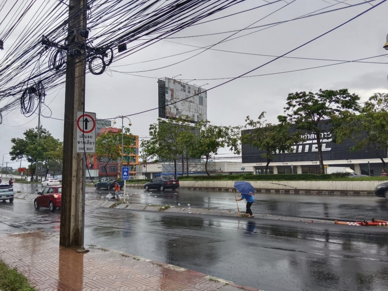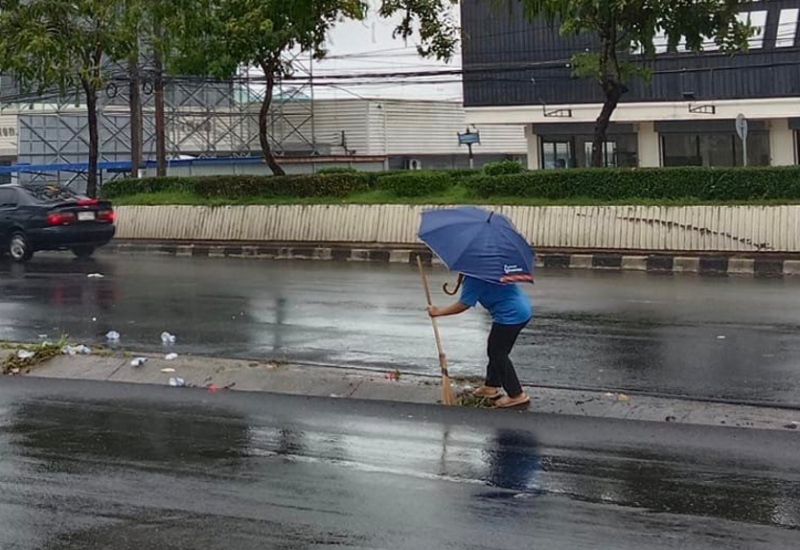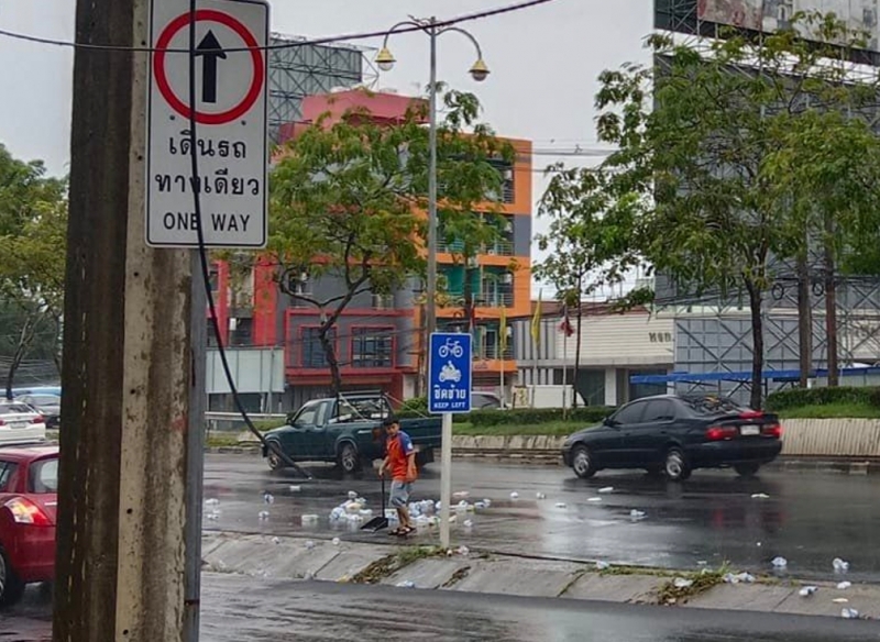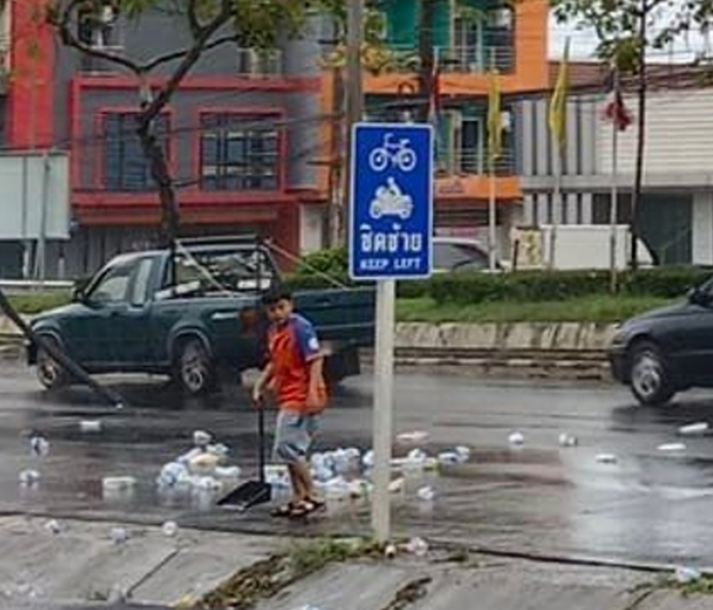 พลเมืองดีสองคนช่วยออกมากวาดออกจากผิวถนน สภาพฝนตกๆ หากรถมอเตอร์ไซค์เหยียบเข้า ก็จะเสี่ยงกับอุบัติเหตุ หรือแม้แต่รถใหญ่ก็เสี่ยงรถจะไถลได้ เขาทั้งสองคนจึงมาช่วยกันเก็บกวาดเอขวดน้ำออกจากพื้นถนน