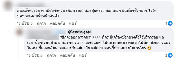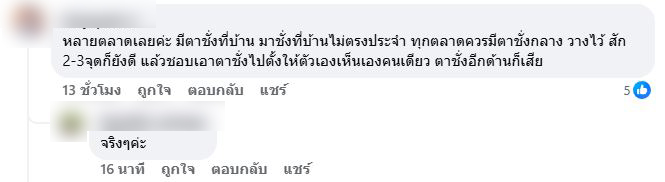 โดยจากกรณีนี้ได้มีคนเข้าไปแสดงความคิดเห็นกันเป็นจำนวนมาก เช่น หลายตลาดเลยค่ะ มีตาชั่งที่บ้าน มาชั่งที่บ้านไม่ตรงประจำ ทุกตลาดควรมีตาชั่งกลาง วางไว้ สัก 2-3จุดก็ยังดี แล้วชอบเอาตาชั่งไปตั้งให้ตัวเองเห็นเองคนเดียว ตาชั่งอีกด้านก็เสีย , ส่วนมากจะไม่ค่อยวางถาดจะใส่ปลาตักปลาแล้ววางเสียส่วนใหญ่ต้องขอดู ถ้ารู้สึกว่าน้ำหนักไม่ได้ ,