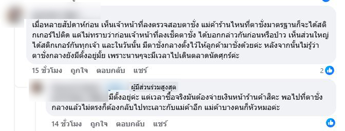 เมื่อหลายสัปดาห์ก่อน เห็นเจ้าหน้าที่ลงตรวจสอบตาชั่ง แม่ค้าร้านไหนที่ตาชั่งมาตรฐานก็จะได้สติกเกอร์ไปติด แต่ไม่ทราบว่าก่อนเจ้าหน้าที่ลงเช็คตาชั่ง ได้บอกกล่าวกันก่อนหรือป่าว เห็นส่วนใหญ่ได้สติกเกอร์กันทุกเจ้า และในวันนั้น มีตาชั่งกลางตั้งไว้ให้ลูกค้ามาชั่งด้วยค่ะ หลังจากนั้นไม่รู้ว่า ตาชั่งกลางยังมีตั้งอยู่มั้ย เพราะนานๆจะมีเวลาไปเดินตลาดนัดศุกร์ค่ะ ,