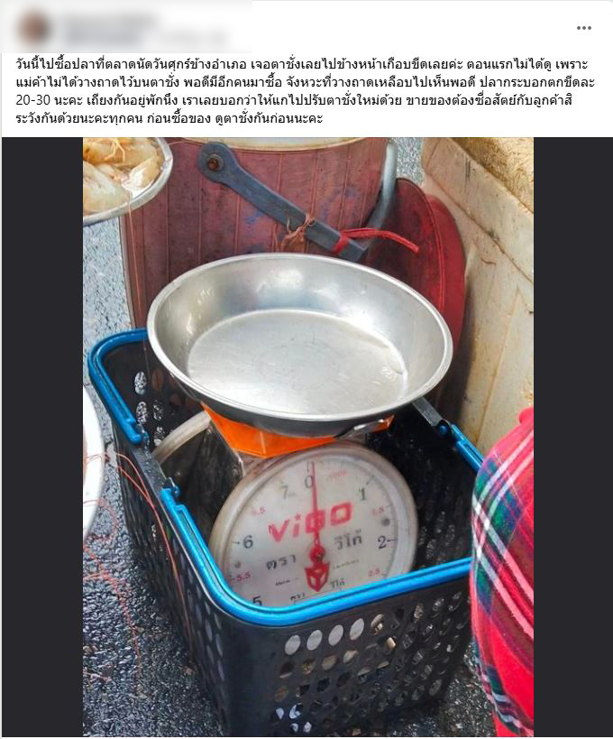 โดยใจความในโพสต์ระบุว่า วันนี้ไปซื้อปลาที่ตลาดนัดวันศุกร์ข้างอำเภอ เจอตาชั่งเลยไปข้างหน้าเกือบขีดเลยค่ะ ตอนแรกไม่ได้ดู เพราะแม่ค้าไม่ได้วางถาดไว้บนตาชั่ง พอดีมีอีกคนมาซื้อ จังหวะที่วางถาดเหลือบไปเห็นพอดี ปลากระบอกตกขีดละ 20-30 นะคะ เถียงกันอยู่พักนึง เราเลยบอกว่าให้แกไปปรับตาชั่งใหม่ด้วย ขายของต้องซื่อสัตย์กับลูกค้าสิ ระวังกันด้วยนะคะทุกคน ก่อนซื้อของ ดูตาชั่งกันก่อนนะคะ