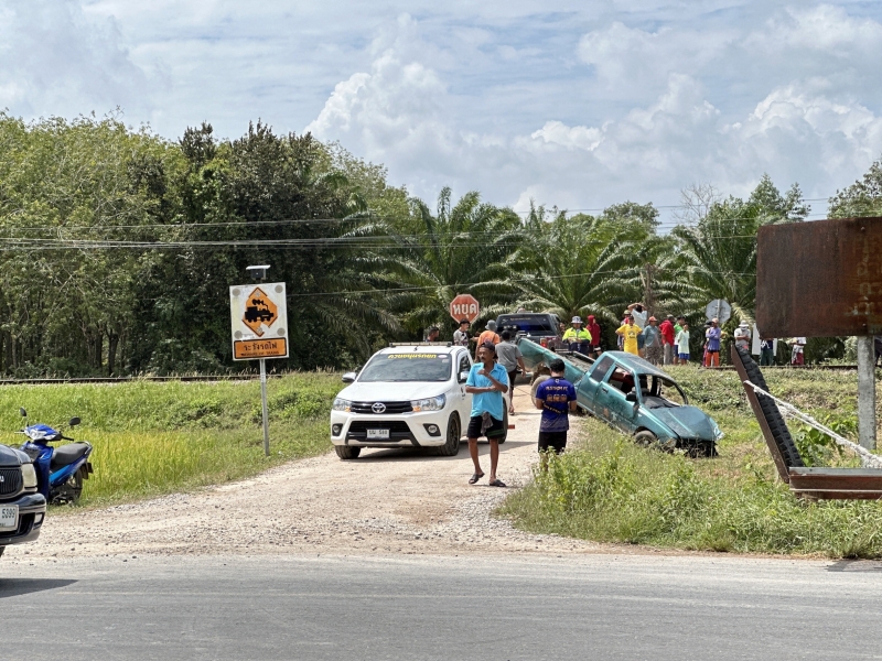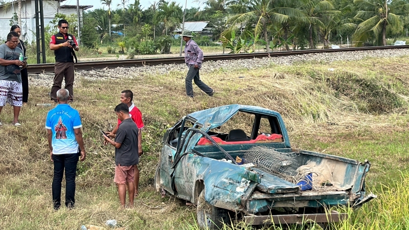 รถไฟชนกระบะลอยตกทุ่งนา คนขับอาการสาหัส