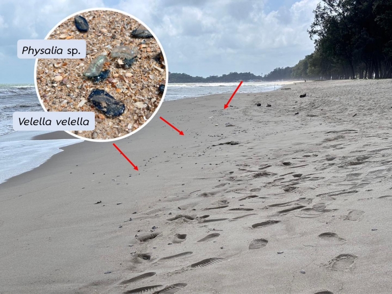 พบการแพร่กระจายของแมงกะพรุนกะลาสีเรือตามลมชนิด Velella velella ขนาดลำตัวเฉลี่ย 3-5 ซม. จำนวน 650 ตัว/ 100 ม. และแมงกะพรุนหัวขวด (Bluebottle Jellyfish) สกุลไฟซาเลีย (Physalia sp.) ขนาดลำตัวเฉลี่ย 1-4 ซม. จำนวน 18 ตัว/ 100 ม.