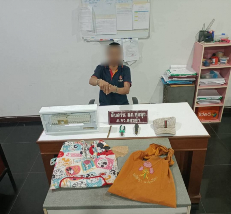 ควบคุมตัวผู้ต้องหาวัย 29 ปี ที่อยู่ตามภูมิลำเนา พื้นที่ตำบลท่าโพธิ์ อ.สะเดา จ.สงขลา พร้อมของกลางตู้คอนซูมเมอร์(ตู้ไฟ) และอุปกรณ์ที่ใช้ในการก่อเหตุ(คีม,ไขควง) กระเป๋าจำนวน 2 ใบ และหมวก 1 ลูก