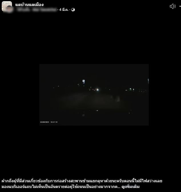 โดยข้อความจากโพสต์ระบุว่า ฝากถึงผู้ที่มีส่วนเกี่ยวข้องกับการก่อสร้างสะพานข้ามแยกคูหาด้วยนะครับ ตอนนี้ไม่มีไฟสว่างเลย มองแบริเออร์แทบไม่เห็น เป็นออันตรายต่อผู้ใช้ถนนเป็นอย่างมาก จากคลิปเป็นวันที่ 3/3/68 เวลา 22.36 น.