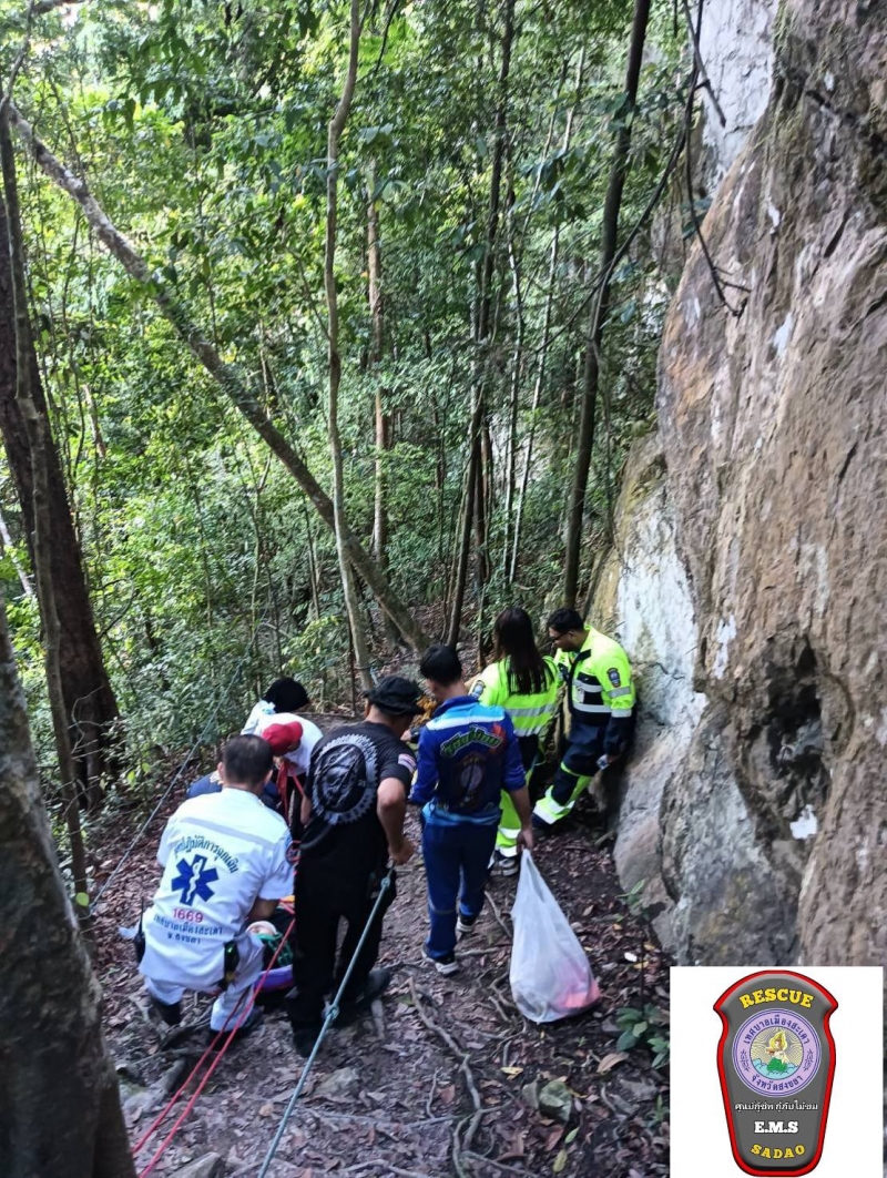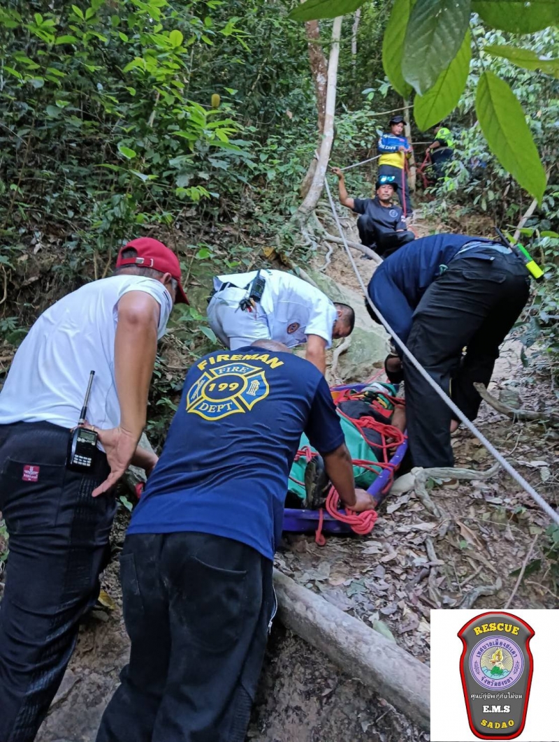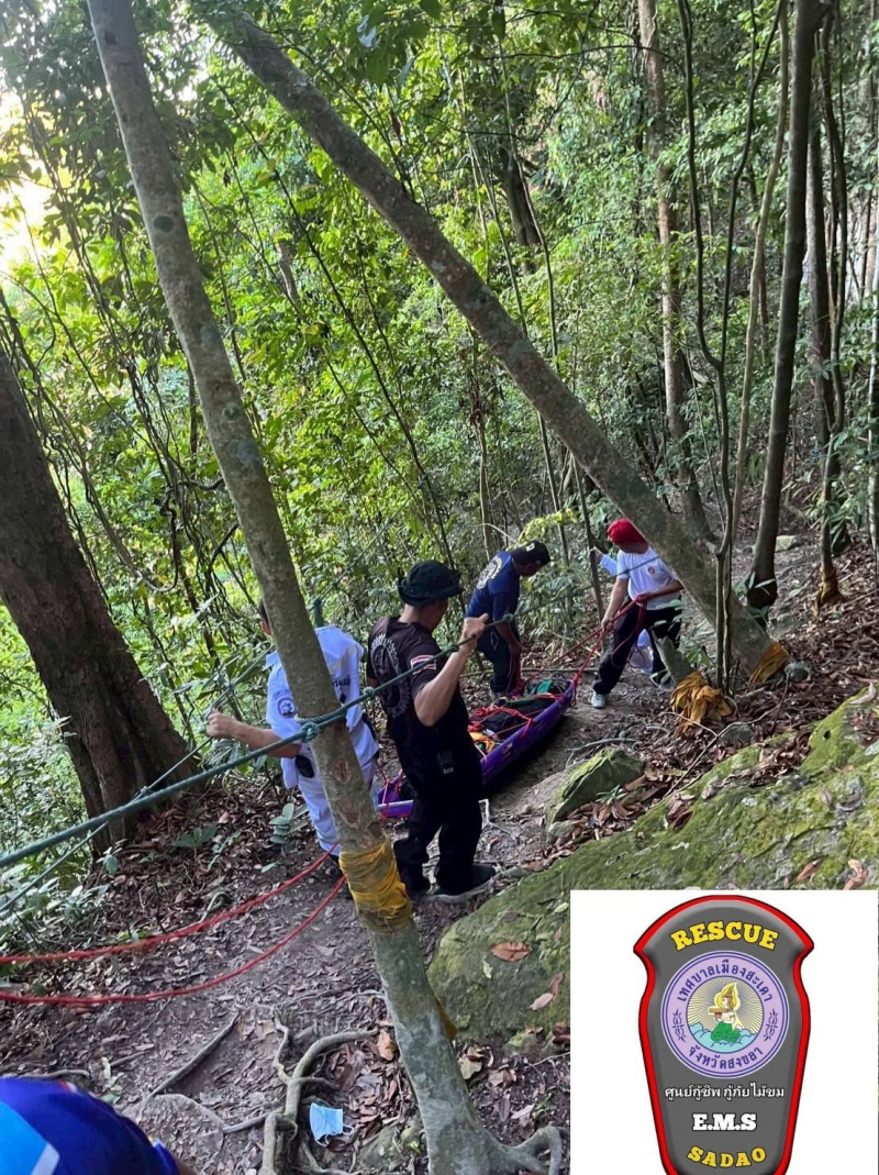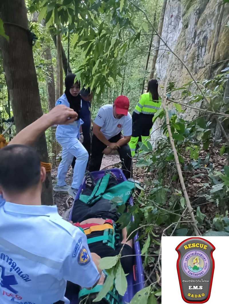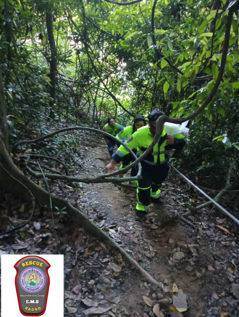 จากนั้นในที่เกิดเหตุเจ้าหน้าที่ได้ทำการปฐมพยาบาลเบื้องต้น ก่อนจะนำลงจากยอดเขาด้วยความลำบากและต้องใช้เจ้าหน้าที่กู้ภัยหลายคนในการลำเลียงร่างผู้บาดเจ็บลงมาจนสำเร็จ ใช้เวลาราวๆกว่า 1 ชม. และส่งต่อรถALS รพ.สะเดา นำส่ง รพ.สะเดาอย่างเร่งด่วนก่อนจะแจ้งให้ญาติทราบ