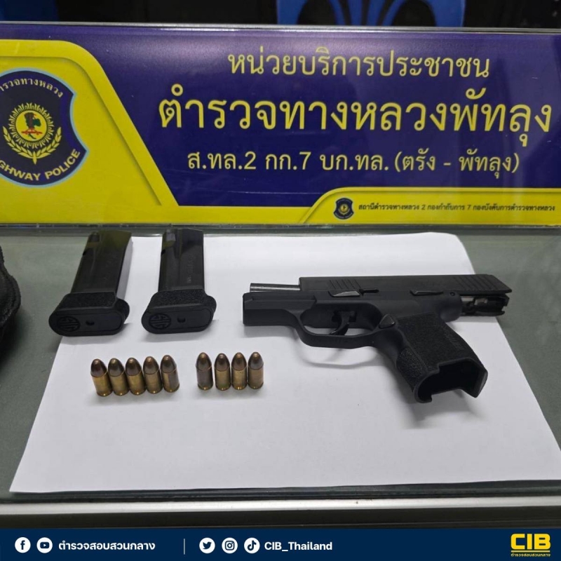 พบอาวุธปืนพกสั้น ชนิดกึ่งอัตโนมัติ ขนาด 9 มม. จำนวน 1 กระบอก ไม่มีใบอนุญาตมาแสดง เจ้าหน้าที่ตำรวจได้จึงแจ้งข้อกล่าวหาแก่ผู้ต้องหาทราบ จากนั้น นำตัวผู้ต้องหาพร้อมของกลางทั้งหมดมาทำบันทึกจับกุมที่หน่วยฯ พัทลุง และนำส่งพนักงานสอบสวน สภ.ศรีนครินทร์ จ.พัทลุง เพื่อดำเนินคดีตามกฎหมายต่อไป