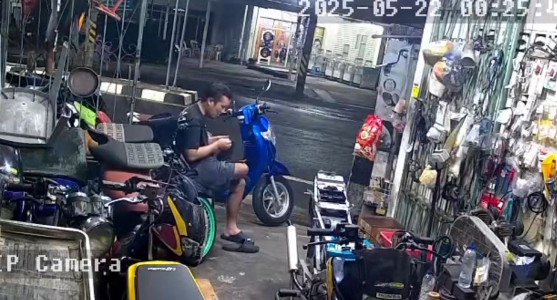 โดยภาพจากกล้องวงจรปิดสามารถบันทึกช่วงเวลาที่เกิดเหตุไว้ได้ เป็นช่วงเวลาประมาณเที่ยงคืน ช่างนาต เจ้าของร้านซ่อมรถมอเตอร์ไซค์ได้นั่งอยู่บริเวณเก้าอี้หน้าร้าน
