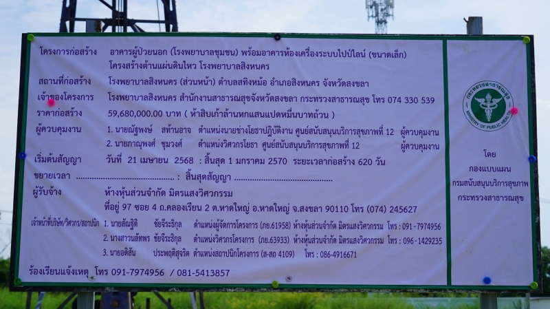 สำหรับโครงการก่อสร้างอาคารผู้ป่วยนอก (โรงพยาบาลชุมชน) พร้อมอาคารห้องเครื่องระบบไปป์ไลน์ (ขนาดเล็ก) โครงสร้างต้านแผ่นดินไหว โรงพยาบาลสิงหนคร งบก่อสร้าง 59,680,000 บาท เริ่มสัญญาก่อสร้าง 21 เมษายน 2568 สิ้นสุด 1 มกราคม 2570