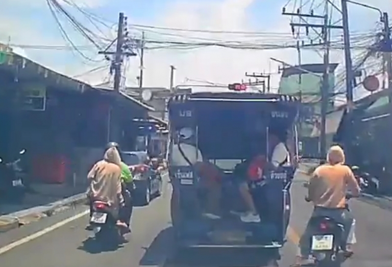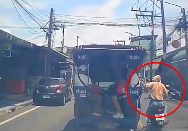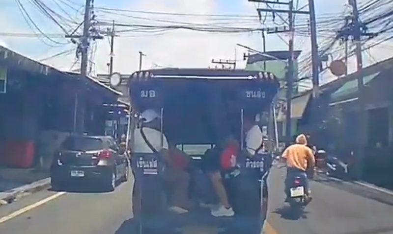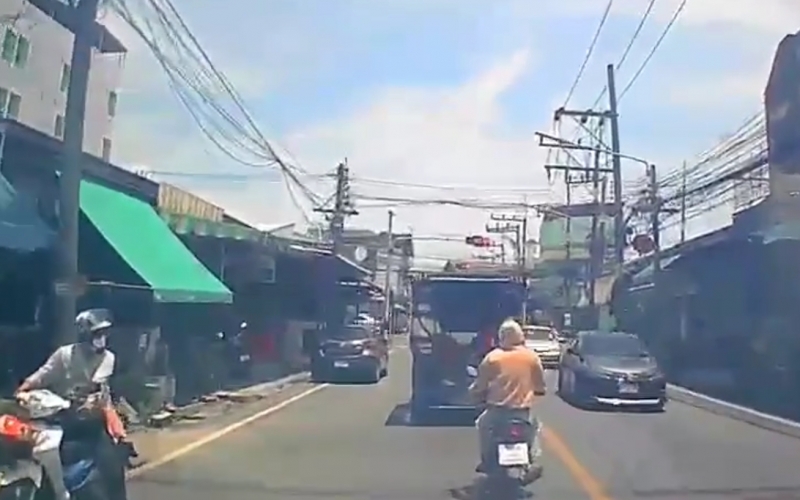 ภาพจากกล้องวงจรได้จับภาพชายรายหนึ่งขับมอเตอร์ไซค์สวมฮู้ดสีเหลืองขับออกมาจากข้างทางริมถนน ก่อนที่รถสองแถวคันดังกล่าววิ่งออกมาในทางตรง จู่ๆชายคนดังกล่าวก็ได้ขับมอไซค์ตามหลังรถสองแถวตามที่ปรากฎในภาพ