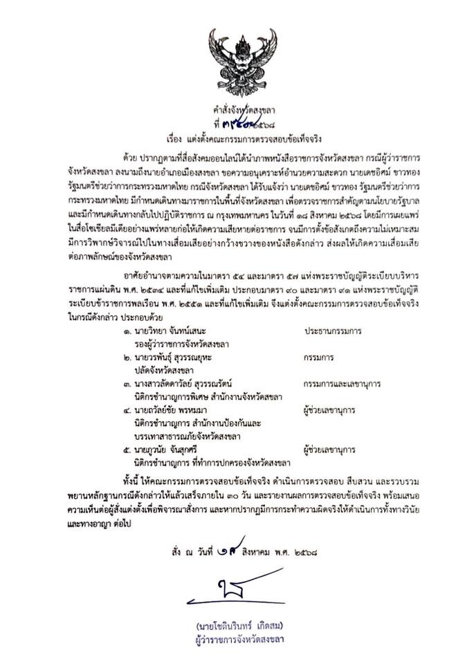 ทั้งนี้ ตามคำสั่งดังกล่าวระบุ ให้คณะกรรมการตรวจสอบข้อเท็จจริง ดำเนินการตรวจสอบ สืบสวน และรวบรวมพยานหลักฐานกรณีดังกล่าวให้แล้วเสร็จภายใน ๓๐ วัน และรายงานผลการตรวจสอบข้อเท็จจริง พร้อมเสนอความเห็นต่อผู้สั่งแต่งตั้งเพื่อพิจารณาสั่งการ และหากปรากฏมีการกระทำความผิดจริงให้ดำเนินการทั้งทางวินัยและทางอาญาต่อไป สั่ง ณ วันที่ ๑๘ สิงหาคม พ.ศ. ๒๕๖๘ ลงนาม นายโชตินรินทร์ เกิดสม ผู้ว่าราชการจังหวัดสงขลา