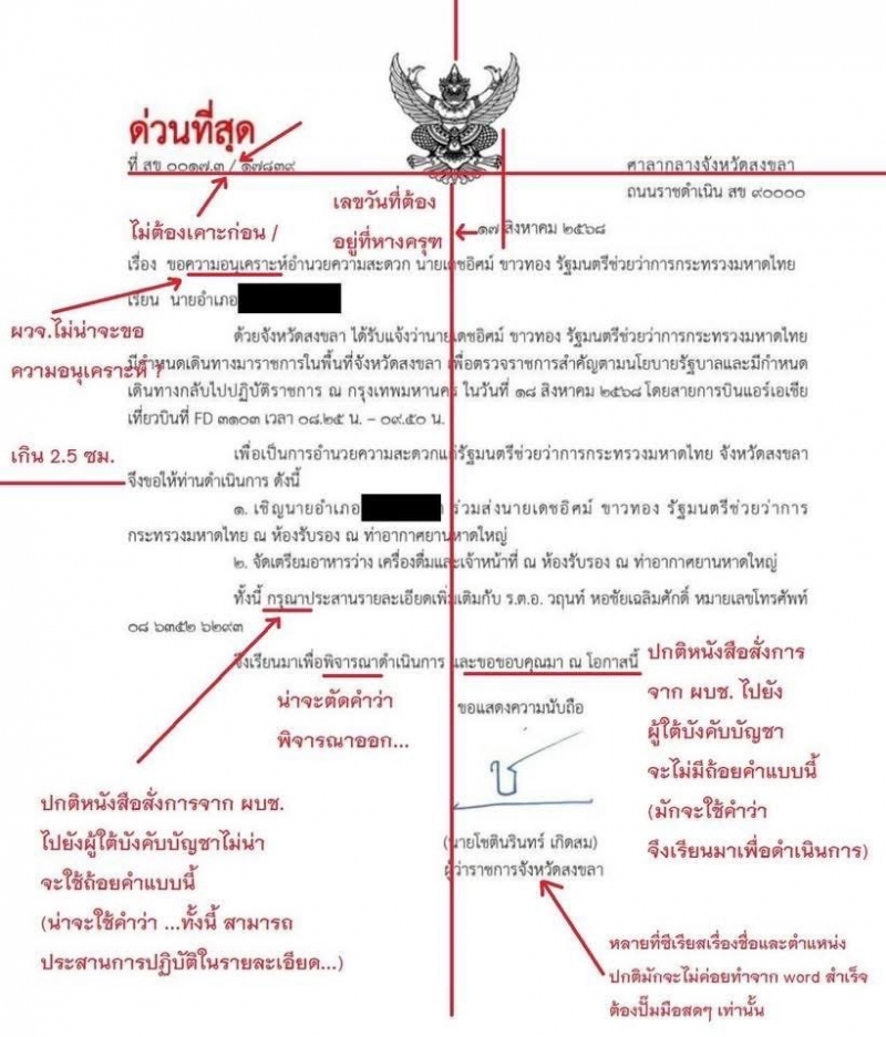 อย่างไรก็ตามกรณีที่เกิดขึ้น ผู้เชี่ยวชาญด้านการทำหนังสือราชการยังตั้งข้อสังเกตว่า หนังสือราชการฉบับดังกล่าวมีหลายจุดไม่ถูกต้อง เช่น เรื่องการใช้ถ้อยคำในหนังสือ ซึ่งหากเป็นหนังสือสั่งการจากผู้บังคับบัญชาลงไปจะไม่ใช้ถ้อยคำว่า ตั้งเรื่อง ขอความอนุเคราะห์ หรือลงท้ายว่า ขอขอบคุณมา ณ โอกาสนี้ ส่วนชื่อเต็มใต้ลงนามลายเซ็นต์ ในทางปฏิบัติปกติมักเป็นการประทับตราสดเท่านั้น นอกจากนี้ยังมีรูปแบบฟอร์มเอกสารราชการที่พิมพ์ผิดเพี้ยนไปจากที่ควรจะเป็น ซึ่งจากข้อสังเกตต่าง ๆ ทำให้ทราบว่าหากเป็นหนังสือสั่งการจากผู้ว่าราชการจังหวัดสงขลาจริง ถ้อยคำบนหนังสือจะต้องปรากฏข้อสั่งการอีกแบบหนึ่ง และแบบฟอร์มเอกสารราชการต้องถูกต้องตามระเบียบ