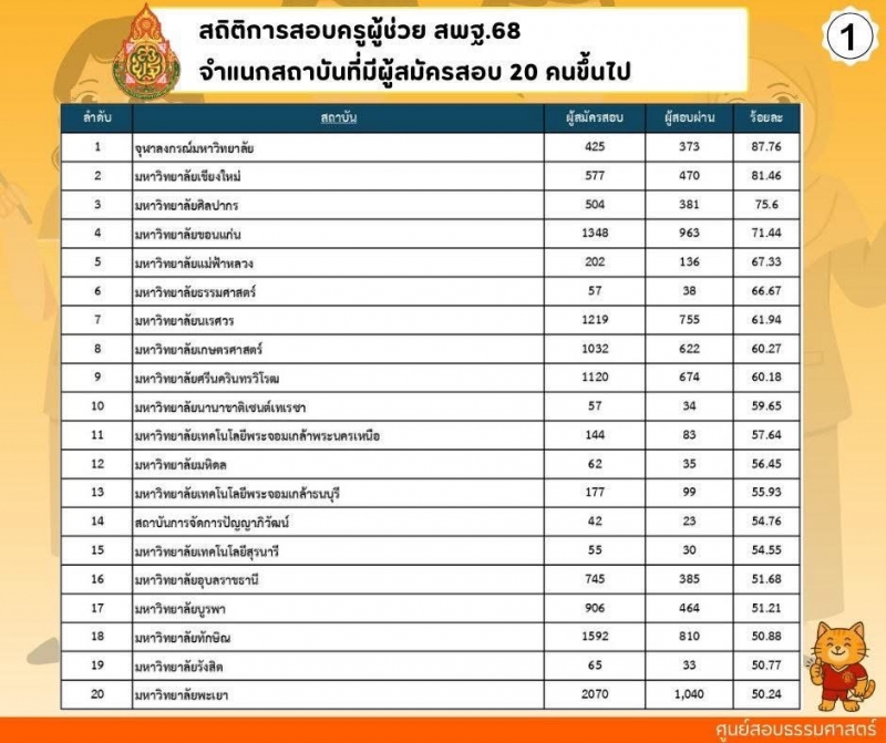โดยสถิติจากการสอบครูผู้ช่วย สพฐ. ปี พ.ศ. 2568 จากแหล่งข้อมูลของศูนย์สอบมหาวิทยาลัยธรรมศาสตร์ พิจารณาเฉพาะสถาบันที่มีผู้สมัครสอบเกิน 20 คนขึ้นไป