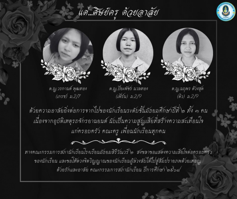 ล่าสุดทราบชื่อผู้เสียชีวิตทั้ง 3 ราย เป็นนักเรียนชั้นมันธยมศึกษาปีที่ 2 โรงเรียนมัธยมสิริวัณวรี 2 สงขลา