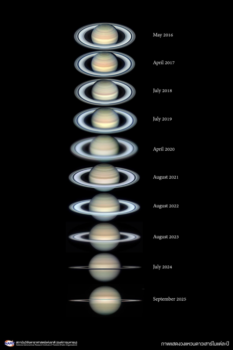 ในปีนี้ วงแหวนดาวเสาร์ปรากฏในลักษณะบางเฉียบ เนื่องจากเพิ่งผ่านช่วงที่ดาวเสาร์หันระนาบวงแหวนเข้าหาโลกเมื่อปลายเดือนมีนาคม 2568 ที่ผ่านมา ปรากฏการณ์นี้จะเกิดขึ้นประมาณทุก ๆ 15 ปี ตามการเปลี่ยนแปลงของมุมเอียงวงแหวนที่สัมพันธ์กับการโคจรรอบดวงอาทิตย์ของดาวเสาร์ ซึ่งนับจากปีนี้เป็นต้นไป ดาวเสาร์จะค่อย ๆ หันขั้วใต้เข้าหาโลก ทำให้ระนาบวงแหวนมีมุมเอียงออกจากโลกมากที่สุด และจะเห็นวงแหวนดาวเสาร์ผ่านกล้องโทรทรรศน์ได้ชัดเจนมากที่สุดอีกครั้งประมาณปี 2575