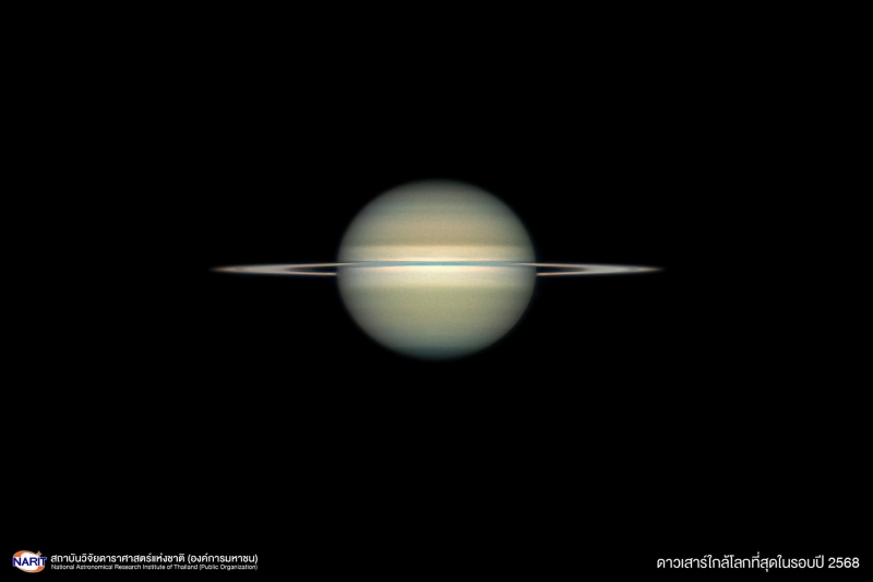 คืนวันที่ 21 กันยายน 2568 บันทึกโดยกล้องโทรทรรศน์ขนาดเส้นผ่านศูนย์กลาง 0.4 เมตร ณ หอดูดาวเฉลิมพระเกียรติ 7 รอบ พระชนมพรรษา สงขลา เผยให้เห็นวงแหวนดาวเสาร์บางเฉียบ ดาวเสาร์โคจรมาอยู่ในตำแหน่งตรงข้ามดวงอาทิตย์ (Saturn Opposition) คือ ดวงอาทิตย์ โลก และดาวเสาร์ เรียงตัวอยู่ในแนวเส้นตรง ส่งผลให้ดาวเสาร์อยู่ใกล้โลกที่สุดในรอบปี ห่างประมาณ 1,279 ล้านกิโลเมตร (ปกติดาวเสาร์มีระยะห่างจากโลกเฉลี่ยประมาณ 1,434 ล้านกิโลเมตร) ในช่วงเดือนนี้ ดาวเสาร์จะปรากฏสว่างเด่นทางทิศตะวันออกหลังดวงอาทิตย์ตกลับขอบฟ้า มองเห็นด้วยตาเปล่าได้อย่างชัดเจน สังเกตการณ์ได้ตลอดคืนจนถึงรุ่งเช้า