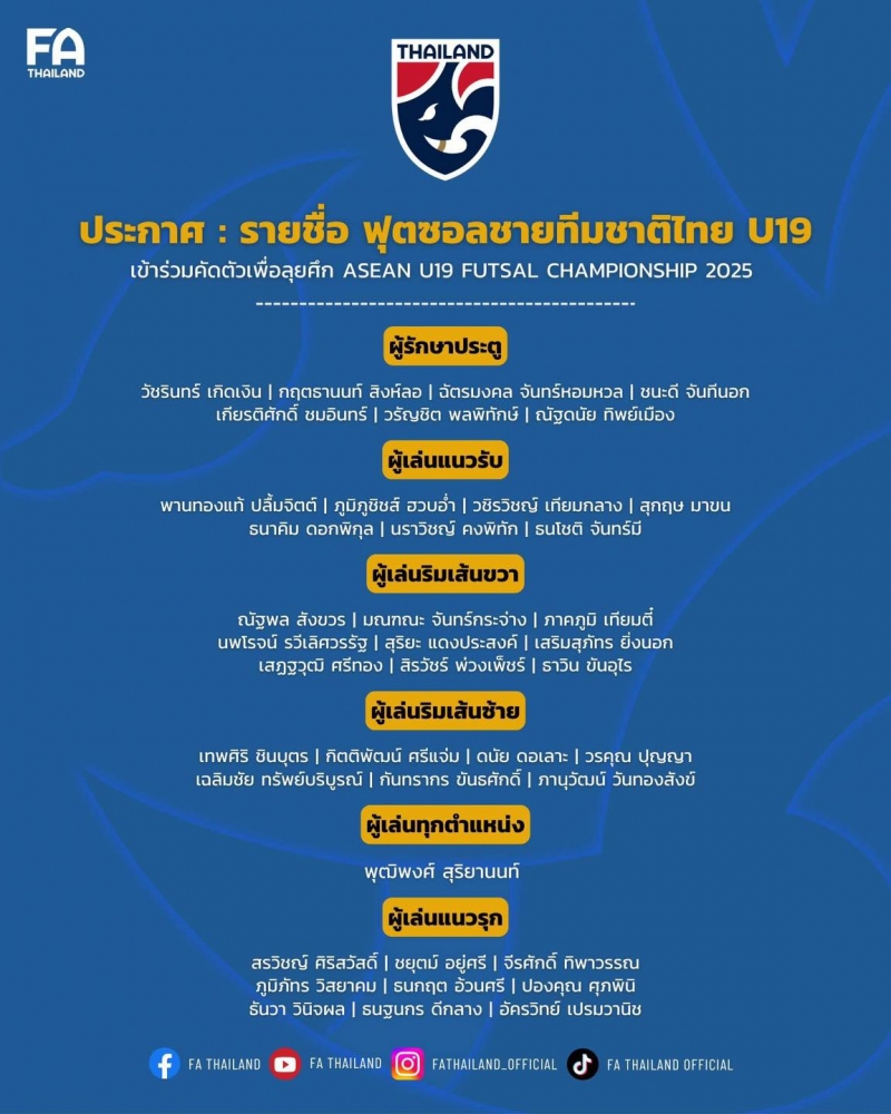 สมาคมกีฬาฟุตบอลแห่งประเทศไทย ในพระบรมราชูปถัมภ์ ประกาศรายชื่อ 40 นักฟุตซอลชายทีมชาติไทย รุ่นอายุไม่เกิน 19 ปี เข้าร่วมคัดตัวนักกีฬา รายการ ASEAN U19 FUTSAL CHAMPIONSHIP 2025 ระหว่างวันที่ 22-28 ธันวาคม 2568 ที่อาคารโรงยิมเนเซียม อบจ.นนทบุรี