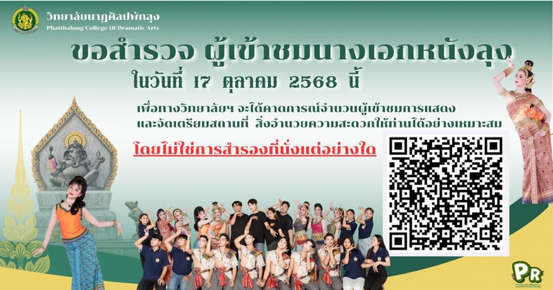 จึงขอเชิญชวนทุกท่าน ร่วมรับชมการแสดง “นางเอกหนังลุง ” และการแสดงอื่นๆ สุดยิ่งใหญ่ตระการตาอย่างเต็มรูปแบบ โดยในวันศุกร์ที่ 17 ตุลาคม 2568 ตั้งแต่เวลา 18.30 น. เป็นต้นไป ณ อาคารโดมอเนกประสงค์ วิทยาลัยนาฏศิลปพัทลุง จ.พัทลุง และในวันที่ 28 ตุลาคม 2568 งานทอดกฐินวัดนาหม่อม อ.นาหม่อม จ.สงขลา เวลา 18.30 น. เป็นต้นไป