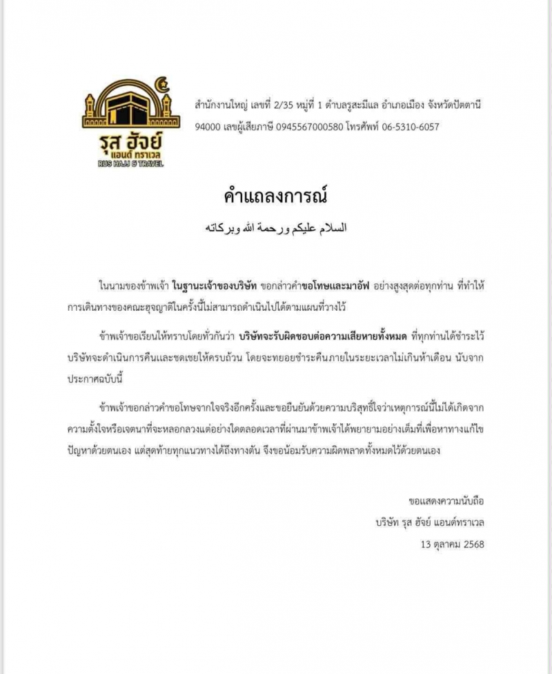 โดยในแถลงการณ์ ระบุว่า ”ในนามของข้าพเจ้า ในฐานะเจ้าของบริษัท ขอกล่าวคำขอโทษและมาอัฟ อย่างสูงสูงสุดต่อทุกท่าน ที่ทำให้การเดินทางของคณะฮุจญาจในครั้งนี้ไม่สามารถดำเนินไปได้ตามแผนที่วางไว้ ข้าพเจ้าขอเรียนให้ทราบโดยทั่วกันว่า บริษัทจะรับผิดชอบต่อความเสียหายทั้งหมด ที่ทุกท่านได้ชำระไว้ บริษัทจะดำเนินการคืนและชดเชยให้ครบถ้วน โดยจะทยอยชำระคืนภายในระยะเวลาไม่เกินห้าเดือน นับจากประกาศฉบับนี้ ข้าพเจ้าขอกล่าวคำขอโทษ จากใจจริงอีกครั้งและขอยืนยันด้วยความบริสุทธิ์ใจว่า เหตุการณ์นี้ไม่ได้เกิดจากความตั้งใจหรือเจตนาที่จะหลอกลวงแต่อย่างใด ตลอดเวลาที่ผ่านมาข้าพเจ้าได้พยายามอย่างเต็มที่เพื่อหางแก้ไขปัญหาด้วยตนเอง แต่สุดท้ายทุกแนวทางได้ถึงทางตัน จึงขอน้อมรับความผิดพลาดทั้งหมดไว้ด้วยตนเอง ขอแสดงความนับถือ ลงนามบริษัท รุส ฮัจย์ แอนด์ทราเวล 13 ตุลาคม 2568“