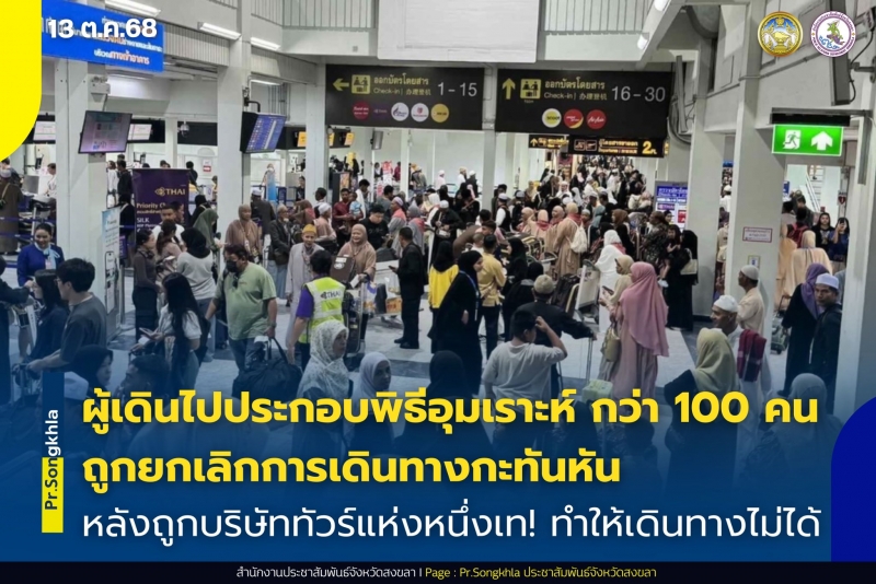 ช่วงเช้าของวันนี้ 13 ต.ค.2568 ที่ สนามบินนานาชาติหาดใหญ่ พี่น้องมุสลิมผู้ประสงค์เดินทางไปประกอบพิธีอุมเราะห์ ณ ประเทศซาอุดิอาระเบียกว่า 100 คน ถูกบริษัททัวร์แห่งหนึ่งเท! กลางสนามบิน โดยไม่มีการแจ้งล่วงหน้า ทำให้ไม่สามารถเดินทางได้ เหตุการณ์ดังกล่าวสร้างความเดือดร้อนเสียหายอย่างรุนแรงแก่ผู้ตั้งใจเดินทางไปแสวงบุญ ซึ่งต้องเสียทั้งเงิน เวลา เเละสำคัญคือความรู้สึก
