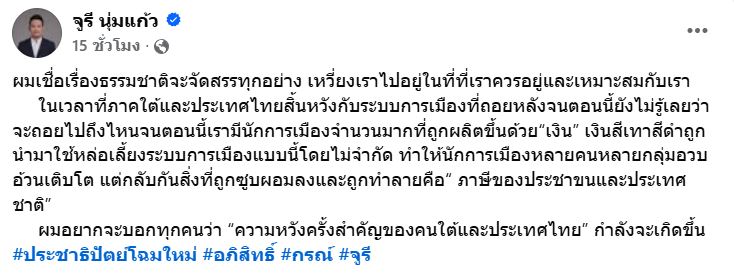 พร้อมแคปชั่น ผมเชื่อเรื่องธรรมชาติจะจัดสรรทุกอย่าง เหวี่ยงเราไปอยู่ในที่ที่เราควรอยู่และเหมาะสมกับเรา ในเวลาที่ภาคใต้และประเทศไทยสิ้นหวังกับระบบการเมืองที่ถอยหลังจนตอนนี้ยังไม่รู้เลยว่าจะถอยไปถึงไหนจนตอนนี้เรามีนักการเมืองจำนวนมากที่ถูกผลิตขึ้นด้วย“เงิน” เงินสีเทาสีดำถูกนำมาใช้หล่อเลี้ยงระบบการเมืองแบบนี้โดยไม่จำกัด ทำให้นักการเมืองหลายคนหลายกลุ่มอวบอ้วนเติบโต แต่กลับกันสิ่งที่ถูกซูบผอมลงและถูกทำลายคือ“ ภาษีของประชาขนและประเทศชาติ”