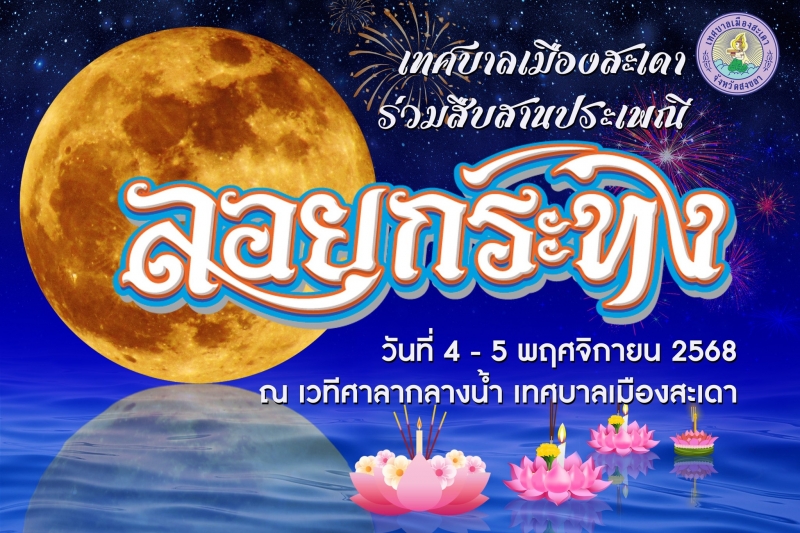 วันที่ 25 ตุลาคม 2568 เทศบาลเมืองสะเดา ขอประชาสัมพันธ์การปรับรูปแบบการจัดงาน ประเพณีลอยกระทง ประจำปี 2568 กำหนดจัดขึ้น วันอังคารที่ 5 พฤศจิกายน 2568