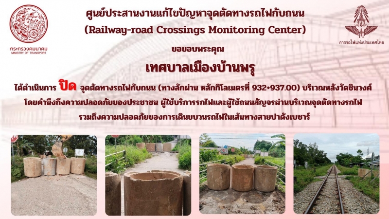 การรถไฟแห่งประเทศไทย ขอขอบพระคุณเทศบาลเมืองบ้านพรุ ที่เล็งเห็นถึงความปลอดภัยของประชาชนผู้ใช้บริการ และผู้ใช้ถนนสัญจรผ่านบริเวณทางลักผ่านดังกล่าว รวมถึงความปลอดภัยของการจัดเดินขบวนรถไฟเส้นทางสายปาดังเบซาร์