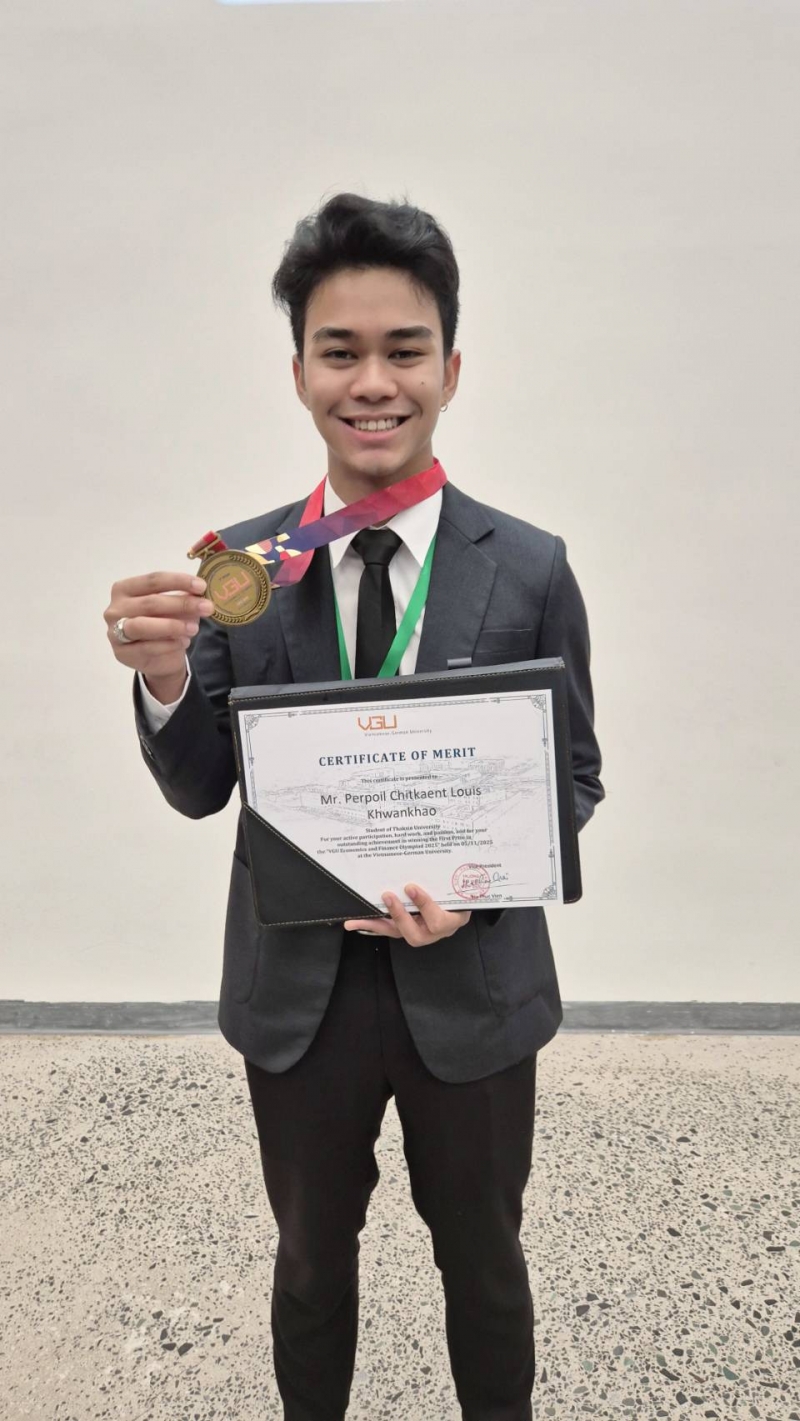 -เหรียญทอง (ชนะเลิศ) ระดับปริญญาตรี Mr.Perpoil Chitkament Louis Khwankhao นิสิตชั้นปีที่ 1 หลักสูตรบริหารธุรกิจบัณฑิต (หลักสูตรนานาชาติ) วิทยาลัยนานาชาติ มหาวิทยาลัยทักษิณ
