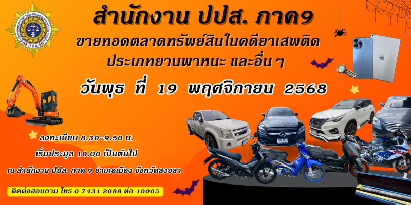วันนี้ 13 พ.ย. 68 สำนักงาน ปปส. ภาค 9 มีความประสงค์ จะขายทอดตลาดทรัพย์สินที่ไม่เหมาะสมจะเก็บรักษาไว้ ครั้งที่ 1/2569 ประเภทยานพาหนะ และอื่น ๆ จำนวน 50 รายการ ตามคำสั่งเลขาธิการ ป.ป.ส.ที่ 5626/2568 ลงวันที่ 20 ตุลาคม 2568 โดยจะทำการขายทอดตลาดในวันพุธที่ 19 พฤศจิกายน 2568 ตั้งแต่เวลา 10.00 น. เป็นต้นไป ณ สำนักงานป้องกันและปราบปรามยาเสพติด ภาค 9 เลขที่ 434 ถนนไทรบุรี ตำบลบ่อยาง อำเภอเมืองสงขลา จังหวัดสงขลา