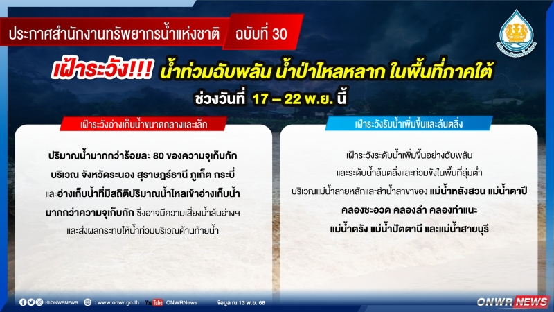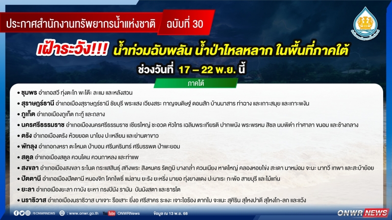 วันที่ 13 พฤศจิกายน 2568 ประกาศ สำนักงานทรัพยากรน้ำแห่งชาติ ฉบับที่ 30/2568 เรื่อง เฝ้าระวังน้ำท่วมฉับพลัน น้ำป่าไหลหลาก ในพื้นที่ภาคใต้