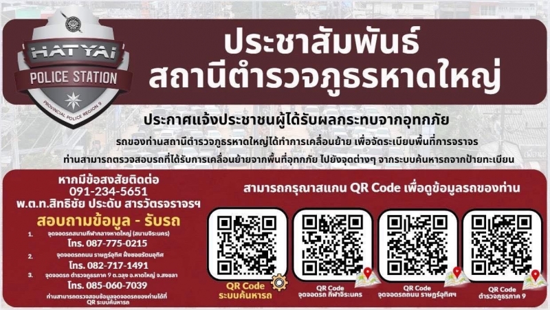 ทั้งนี้ สภ.หาดใหญ่ จะได้ประชาสัมพันธ์ช่องทางติดต่อ พร้อมแนบ QR Code ที่เจ้าของรถสามารถสแกนเพื่อตรวจสอบได้ว่ารถตนเองจอดอยู่ที่ใด พร้อมระบบการตรวจสอบติดต่อรับรถในแต่ละจุด ซึ่งในแต่ละจุดจะมีเจ้าหน้าที่ตำรวจคอยอำนวยความสะดวกกับเจ้าของรถ ขณะเดียวกันตำรวจภูธรภาค 9 ได้กำหนดแผนในการดูแลความปลอดภัยรถที่เก็บไว้เพื่อสร้างความอุ่นใจให้เจ้าของรถด้วย