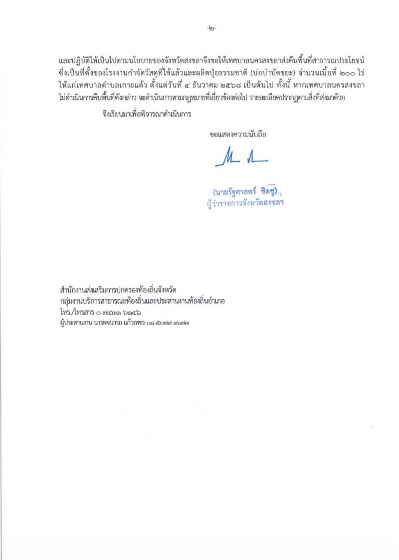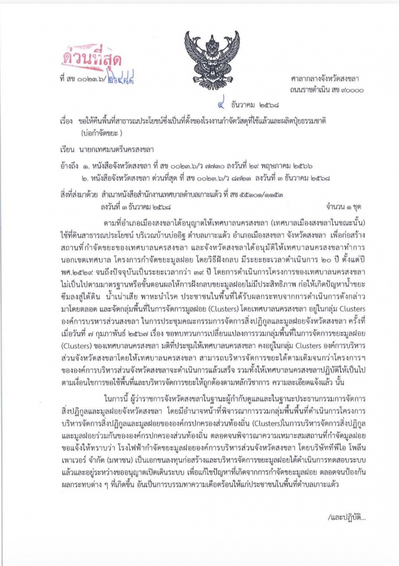 และปฏิบัติให้เป็นไปตามนโยบายของจังหวัดสงขลาจึงขอให้เทศบาลนครสงขลาส่งคืนพื้นที่สาธารณประโยชน์ ซึ่งเป็นที่ตั้งของโรงงานกำจัดวัสดุที่ใช้แล้วและผลิตปุ๋ยธรรมชาติ (บ่อบำบัดขยะ) จำนวนเนื้อที่ ๒๐๐ ไร่ ให้แก่เทศบาลตำบลเกาะแต้ว ตั้งแต่วันที่ ๔ ธันวาคม ๒๕๖๘ เป็นต้นไป ทั้งนี้ หากเทศบาลนครสงขลา ไม่ดำเนินการคืนพื้นที่ดังกล่าว จะดำเนินการตามกฎหมายที่เกี่ยวข้องต่อไป รายละเอียดปรากฏตามสิ่งที่ส่งมาด้วย