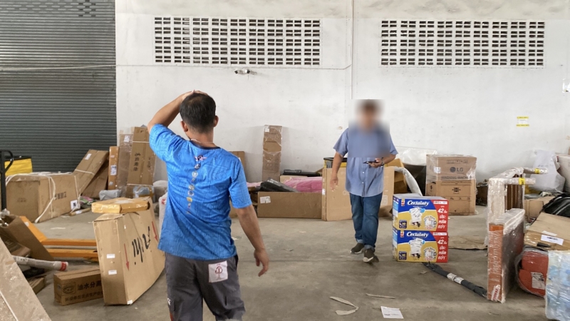 ระหว่างที่ผู้สื่อข่าวกำลังเดินตรวจสอบพัสดุภายในโกดัง พบว่ามีลุงป้า ได้ขี่รถจักรยานยนต์ซ้อนกันมา 2 คน ได้มาตามหาพัสดุที่ตกหล่นอยู่อีก 1 กล่อง เนื่องจากพัสดุถูกส่งมาจากจังหวัดขอนแก่น จำนวน 2 กล่องใหญ่ ซึ่งภายในกล่องเป็นเสื้อผ้าบริจาคน้ำท่วม