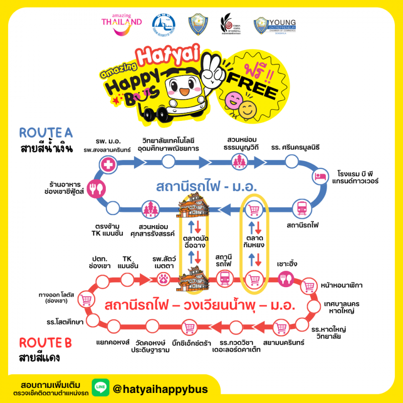 ให้บริการฟรีทุกวัน เวลา 06:00 น. - 19:00 น ติดตามข้อมลข่าวสาร Line ID : @hatvaihappybus