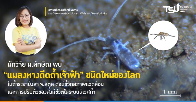 มหาวิทยาลัยทักษิณ โดยนักวิจัยจากคณะวิทยาศาสตร์และนวัตกรรมดิจิทัล พบ “แมลงหางดีดถ้ำเจ้าฟ้า” Lepidonella sirindhornae Nilsai & Jantarit, sp. nov. ชนิดใหม่ของโลก ซึ่งเป็นกลุ่มแมลงหางดีดที่ปรับตัวเข้าถ้ำที่มีวิวัฒนาการอย่างยาวนาน สะท้อนถึงดัชนีชี้วัดสภาพแวดล้อมของระบบนิเวศถ้ำ และความอยู่รอดของสิ่งมีชีวิตในสภาวะที่มีการเปลี่ยนแปลง