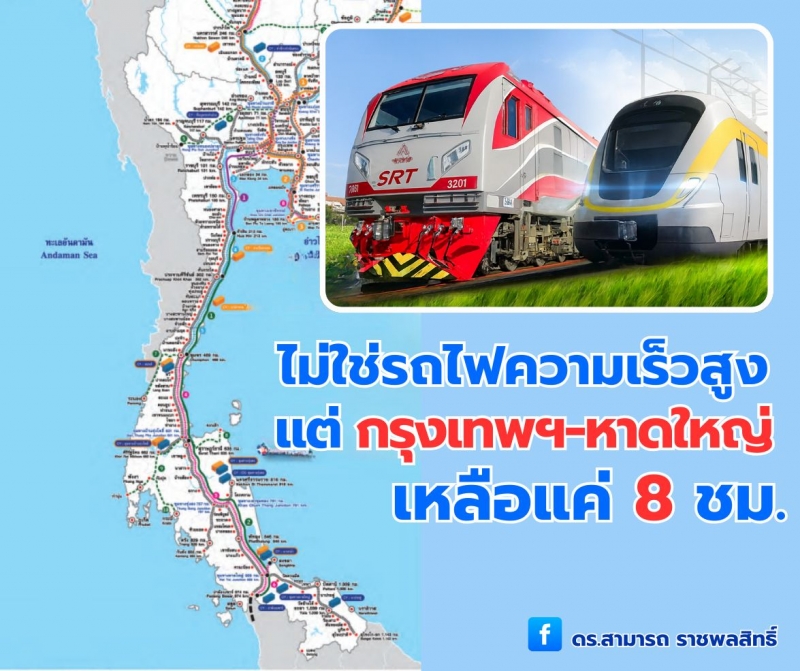 โดยดร.สามารถ อธิบายว่า “ไม่ใช่รถไฟความเร็วสูง” แต่ กรุงเทพฯ-หาดใหญ่ เหลือแค่ 8 ชม. ฟังดูเหมือนฝันใช่ไหมครับ? การเดินทางด้วยรถไฟจากกรุงเทพฯ-หาดใหญ่ ระยะทางเกือบ 1,000 กิโลเมตร จากวันนี้ที่ต้องนั่งกันยาว 14-15 ชั่วโมง จะเหลือแค่ 8 ชั่วโมงเท่านั้น หลายคนอาจคิดว่า ต้องเป็นรถไฟความเร็วสูงเท่านั้นหรือเปล่า คำตอบคือไม่จำเป็นเลย เพราะสิ่งที่เราต้องการจริงๆ คือ รถไฟทางคู่กับรถไฟฟ้า ไม่ใช่รถไฟความเร็วสูงที่มีราคาแพงและต้องรออีกนาน