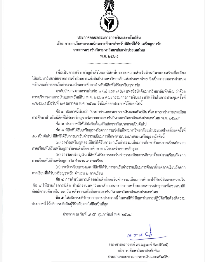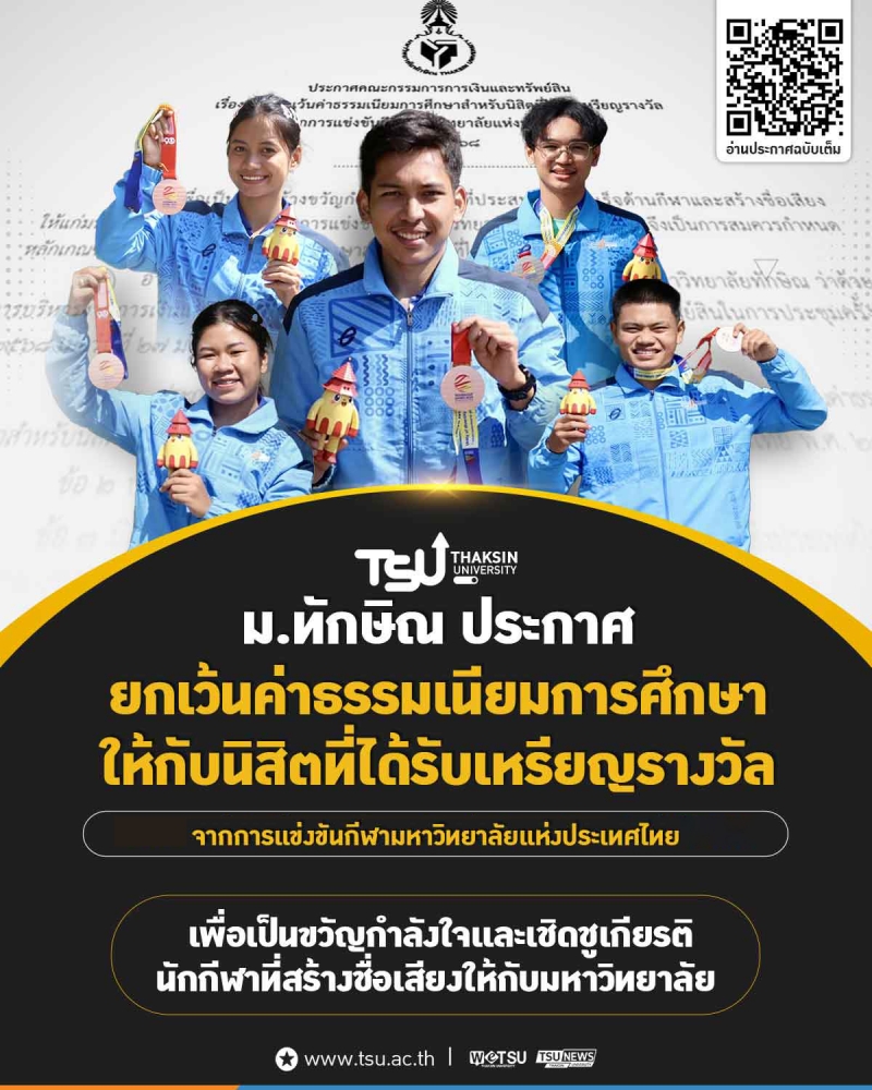 วันนี้ 22 มกราคม 2569 มหาวิทยาลัยทักษิณ ออกประกาศยกเว้นค่าธรรมเนียมการศึกษาให้แก่นิสิตที่ได้รับเหรียญรางวัลจากการแข่งขัน กีฬามหาวิทยาลัยแห่งประเทศไทย เพื่อเป็นการส่งเสริมขวัญกำลังใจและเชิดชูเกียรตินักกีฬาที่สร้างชื่อเสียงให้กับสถาบัน