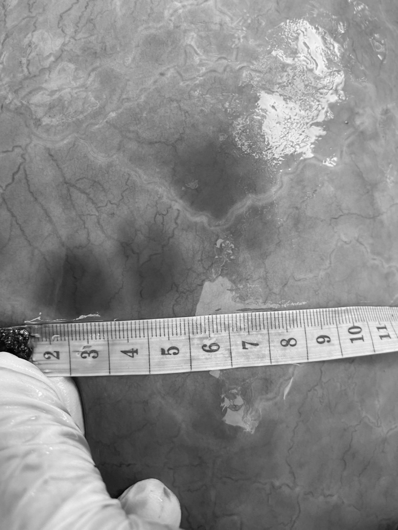ศูนย์อนุรักษ์ทรัพยากรป่าชายเลนที่ 24 ตำมะลัง กำนันผู้ใหญ่บ้านและชาวบ้านตำบลปูยู จ.สตูล เข้าร่วมตรวจสอบพบว่าเป็นวาฬโอมูระ (Omura’s whale; Balaenoptera omurai) เพศเมีย ขนาดลำตัวยาว 4.99 เมตร ยังไม่โตเต็มวัย สภาพซากสด ความสมบูรณ์ของร่างกายอยู่ในเกณฑ์ปกติ (BCS 3/5) ลักษณะภายนอกพบรอยแผลถลอกทั่วลำตัวจากการเกยตื้น ไม่พบร่องรอยความผิดปกติจากเครื่องมือประมงแต่อย่างใด