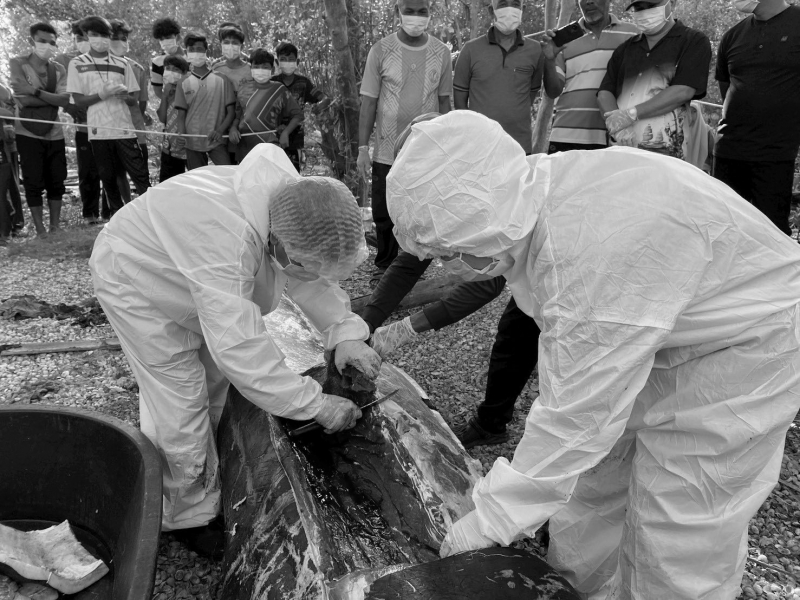 สาเหตุการตายเกิดจากการจมน้ำ โดยคาดว่าสาเหตุโน้มนำเกิดจากการป่วยและพลัดหลงจากแม่ ทั้งนี้ เจ้าหน้าที่ได้ทำการเก็บตัวอย่างชิ้นเนื้อเพื่อนำไปวิเคราะห์ทางห้องปฏิบัติการ ตัวอย่างโครงกระดูกส่วนขากรรไกรล่าง ครีบอก กระดูกเชิงกรานและทำการจัดการซากโดยได้รับความอนุเคราะห์จากองค์การบริหารส่วนตำบลปูยู จังหวัดสตูลเพื่อใช้รถแมคโครในการขุดฝังกลบซากในพื้นที่