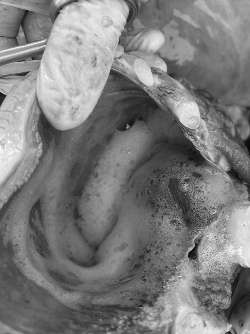 เมื่อเปิดผ่าชันสูตรดูอวัยวะภายในพบว่าหัวใจมีเลือดคั่งและบวมน้ำเล็กน้อย ส่วนของทางเดินหายใจพบฟองอากาศและของเหลวคั่งภายในหลอดลมและเนื้อเยื่อปอด ปอดบวมน้ำ บริเวณเนื้อเยื่อปอดด้านนอกพบลักษณะปื้นสีดำรูปร่างไม่แน่นอน ขนาดประมาณ 1-2 ซม. ส่วนของทางเดินอาหารไม่พบอาหารและสิ่งแปลกปลอมภายในทางเดินอาหาร