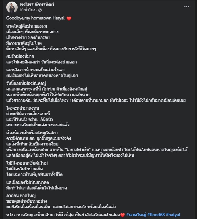 วันนี้ 11 ก.พ. 69 หลังผู้ใช้เฟซบุ๊กรายหนึ่งชื่อว่า พงไพร อักษรนิตย์ ได้โพสต์ข้อความอำลา “หาดใหญ่” บ้านเกิดของตนเอง ท่ามกลางสถานการณ์น้ำท่วมที่เกิดขึ้นซ้ำแล้วซ้ำเล่า จนทำให้เจ้าตัวระบุว่าเริ่มมองไม่เห็นอนาคตของเมือง และตัดสินใจย้ายออก แม้ยังรักและผูกพันกับบ้านเกิดอย่างมาก