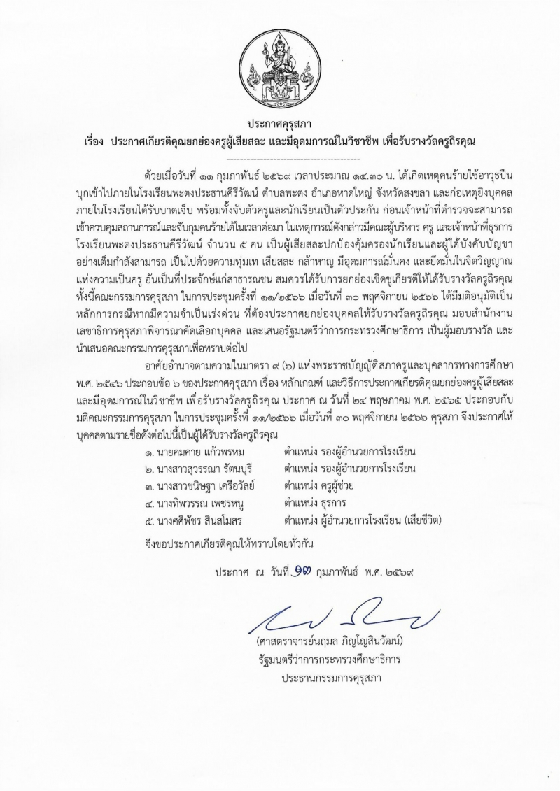 ด้วยเมื่อวันที่ 11 กุมภาพันธ์ 2569 เวลาประมาณ 14.30 น. ได้เกิดเหตุคนร้ายใช้อาวุธปืนบุกเข้าไปภายในโรงเรียนพะตงประธานคีรีวัฒน์ ตำบลพะตง อำเภอหาดใหญ่ จังหวัดสงขลา และก่อเหตุยิงบุคคลภายในโรงเรียนได้รับบาดเจ็บ พร้อมทั้งจับตัวครูและนักเรียนเป็นตัวประกัน ก่อนเจ้าหน้าที่ตำรวจจะสามารถเข้าควบคุมสถานการณ์และจับกุมคนร้ายได้ในเวลาต่อมา ในเหตุการณ์ดังกล่าวมี นางศศิพัชร สินสโมสร ผู้อำนวยการโรงเรียนพะตงประธานคีรีวัฒน์ และคณะผู้บริหาร ครูและเจ้าหน้าที่ธุรการ โรงเรียนพะตงประธานคีรีวัฒน์ จำนวน 5 คน เป็นผู้เสียสละปกป้องคุ้มครองนักเรียนและผู้ใต้บังคับบัญชาอย่างเต็มกำลังสามารถ เป็นไปด้วยความทุ่มเท เสียสละ กล้าหาญ มีอุดมการณ์มั่นคง และยึดมั่นในจิตวิญญาณแห่งความเป็นครู อันเป็นที่ประจักษ์แก่สาธารณชน สมควรได้รับการยกย่องเชิดชูเกียรติ