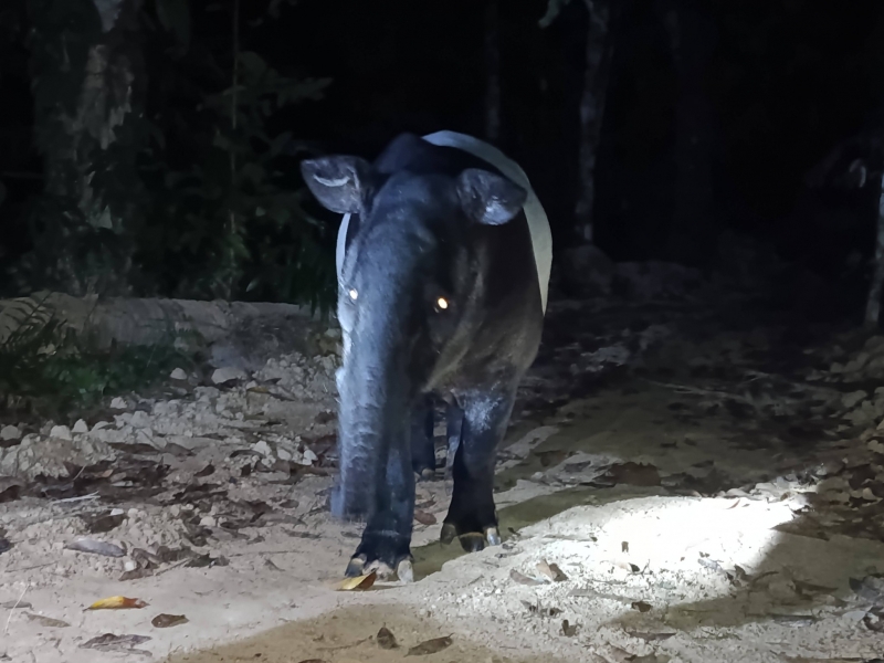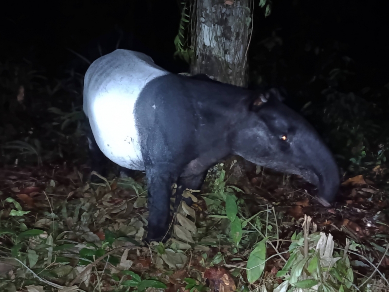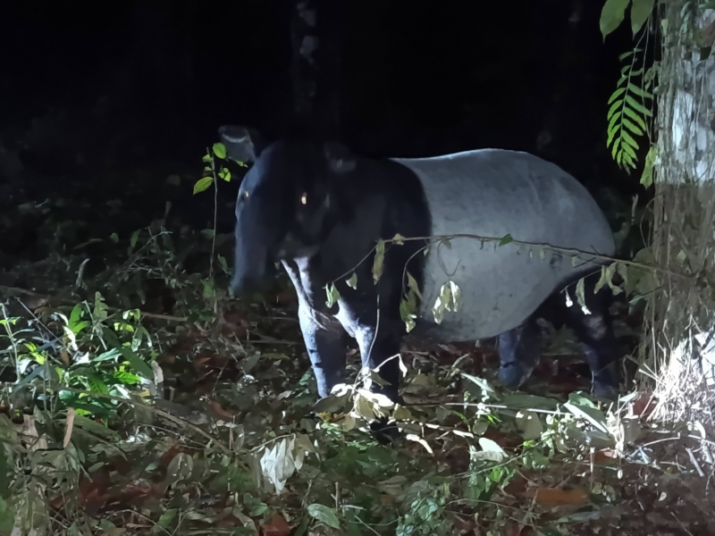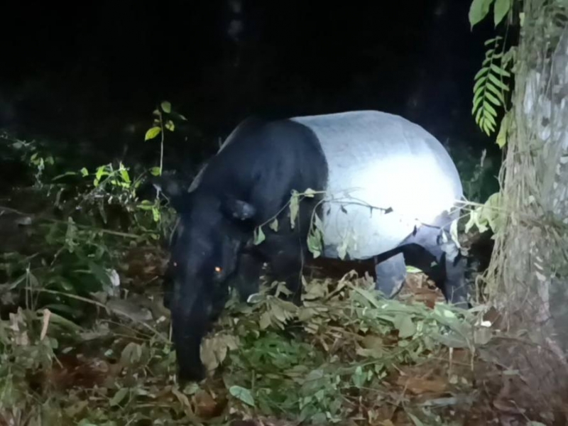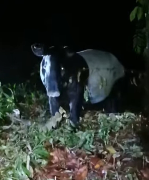 หรือ"ผสมเสร็จ"(Tapir) หนึ่งในสัตว์ป่าหายาก และมีสถานะการคุ้มครองเป็นสัตว์ป่าสงวน ตาม พ.ร.บ.สงวนและคุ้มครองสัตว์ป่า พ.ศ.2562 และยังเป็นสัตว์ที่เป็นตัวบ่งชี้ความอุดมสมบูรณ์ของผืนป่า สมเสร็จ ตัวดังกล่าวอยู่ในช่วงตัวเต็มวัย กำลังเอร็ดอร่อยกับการเคี้ยวผลจำปาดะ ข้างกระท่อมของผู้พบเห็น เป็นภาพที่น่าประทับใจและหาดูได้ยากยิ่ง แต่การแวะมาเยี่ยมเยียนครั้งนี้ก็มาพร้อมกับความห่วงใยในความปลอดภัยของสัตว์ป่าผู้สันโดษตัวนี้ พี่วงศ์เดือน ปรีกมล ผู้พบเห็นภาพน่าประทับใจนี้จึงใช้โทรศัพท์บันทึกภาพและคลิปวีดีโอเป็นหลักฐานแสดงต่อเจ้าหน้าที่ เขตรักษาพันธุ์สัตว์ป่าโตนงาช้าง