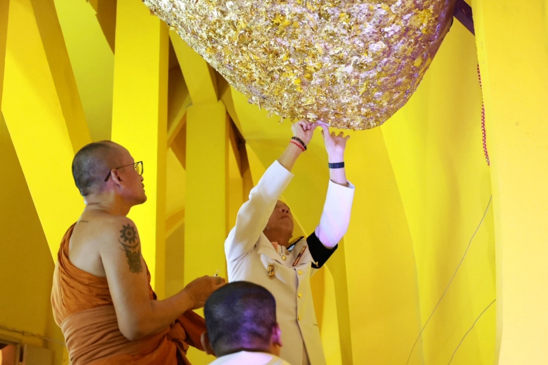 ต่อจากนั้น ประธานในพิธีได้ประกอบพิธี ปิดทองหัวใจองค์พระพุทธมหัตตมงคล ซึ่งถือเป็นพิธีสำคัญที่เปิดให้พุทธศาสนิกชนได้ร่วมสักการะเพียงปีละครั้งในช่วงเทศกาลสงกรานต์เท่านั้น ก่อนที่สมเด็จพระมหาวชิรมังคลาจารย์จะกล่าวสัมโมทนียกถา และประธานในพิธีถวายผ้าไตรพร้อมปัจจัยไทยธรรมแด่ประธานสงฆ์ คณะผู้บริหารร่วมถวายปัจจัยไทยธรรมแด่พระสงฆ์ชั้นผู้ใหญ่โดยพร้อมเพรียง จากนั้นพุทธศาสนิกชน ได้ร่วมประกอบพิธีห่มผ้าพระพุทธมหัตตมงคล เพื่อความเป็นสิริมงคล