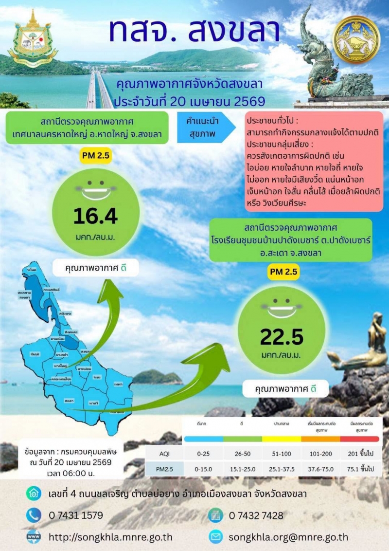 วันนี้ 20 เมษายน 2569 เวลา 06.00 น. ทสจ.สงขลาแจ้งคุณภาพอากาศประจำวันจังหวัดสงขลา เรื่องสถานการณ์ ฝุ่นPM2.5 โดยวันนี้สถานีตรวจคุณภาพอากาศเทศบาลนครหาดใหญ่ อำเภอหาดใหญ่ จังหวัดสงขลา และสถานีตรวจคุณภาพอากาศโรงเรียนชุมชนบ้านปาดังเบซาร์ อำเภอสะเดา จังหวัดสงขลา ตรวจวัดค่าฝุ่นPM2.5 ได้ระหว่าง 16.4 - 22.5 ไมโครกรัม/ลูกบาศก์เมตร