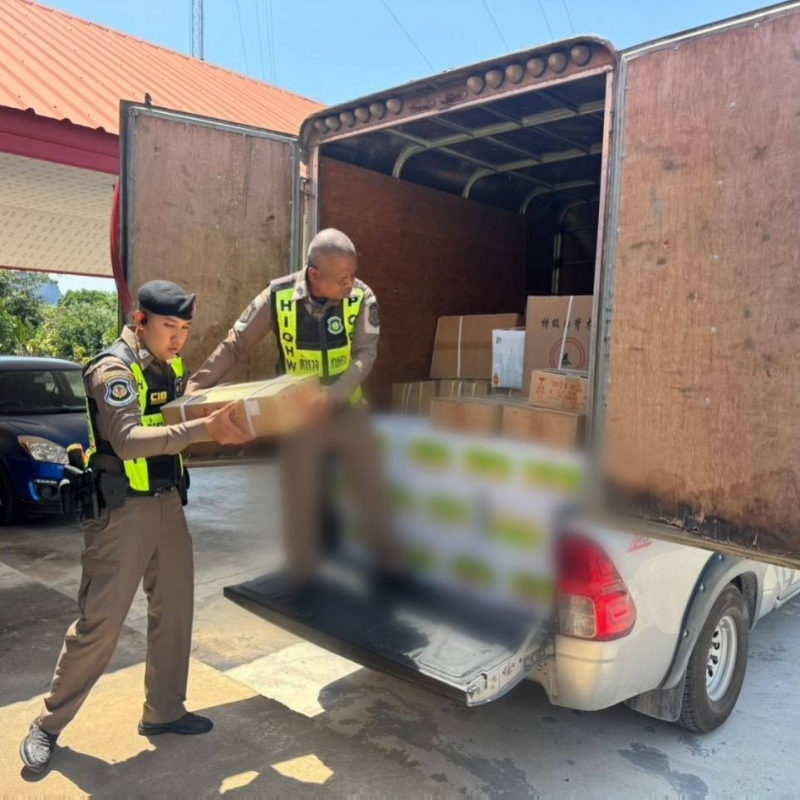 ก่อนจับกุม ตำรวจพบรถต้องสงสัยลักษณะติดตู้ทึบ ไม่มีป้ายทะเบียนด้านหน้าและด้านหลัง จึงส่งสัญญาณให้หยุดตรวจสอบ เมื่อเปิดตรวจค้นภายในรถ พบสินค้าจำนวนมาก เช่น อาหารกระป๋อง เครื่องปรุง ชา ผงเครื่องดื่ม และสินค้าเบ็ดเตล็ด รวมหลายรายการ