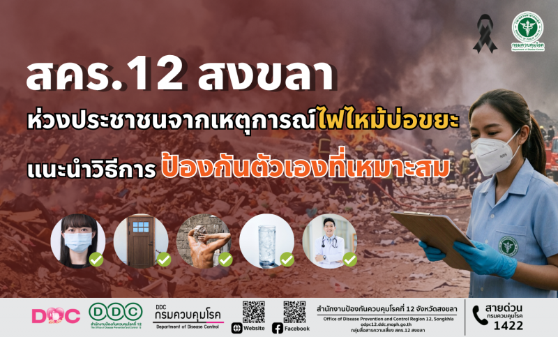 วันที่ 29 เมษายน 2569 นักงานป้องกันควบคุมโรคที่ 12 จังหวัดสงขลา (สคร.12 สงขลา) ห่วงใยประชาชนกลุ่มเสี่ยง (เปราะบาง), ประชาชนในพื้นที่ใกล้เคียงไฟไหม้บ่อขยะ (รอบจุดเกิดเหตุรัศมี 0 - 5 กิโลเมตร), ผู้ปฏิบัติงาน (พนักงานดับเพลิง) บุคลากรหรือเจ้าหน้าที่ที่ลงพื้นที่ และประชาชนทั่วไป พร้อมแนะนำวิธีการป้องกันตัวเองจากควันไฟ ฝุ่นละออง PM2.5 และกลิ่นสารเคมีที่กระทบต่อสุขภาพ กรณีที่เกิดเพลิงไหม้บ่อขยะ ทำให้เกิดควันและสารพิษ
