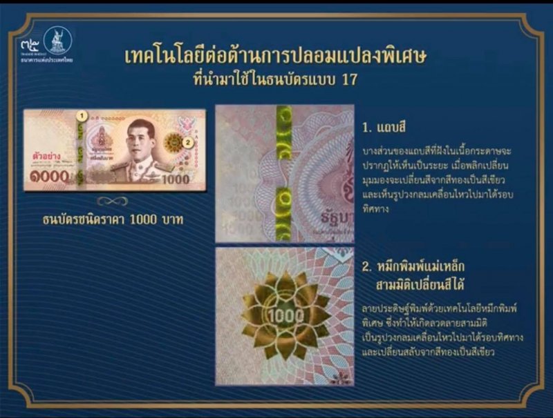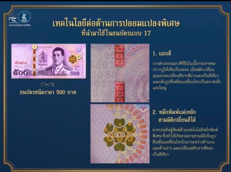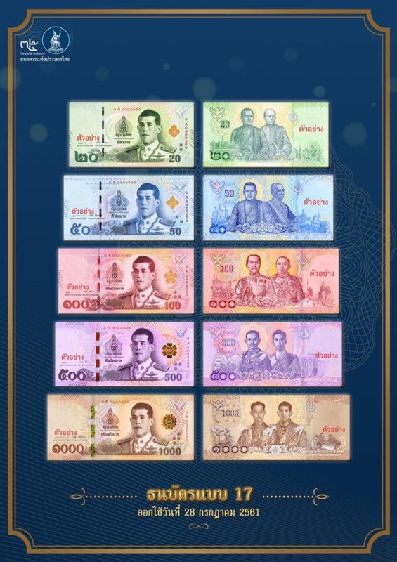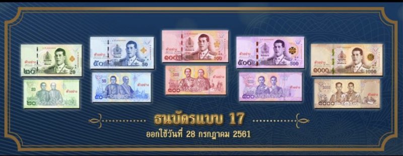 ธปท. จะออกใช้ธนบัตรแบบใหม่ แบบ 17 ชนิดราคา 500 บาท และ 1,000 บาท โดยด้านหน้าของธนบัตรทุกชนิดราคา เชิญพระสาทิสลักษณ์สมเด็จพระเจ้าอยู่หัว ในฉลองพระองค์เครื่องแบบเต็มยศของกองทัพอากาศ เป็นภาพประธาน ด้านหลังของธนบัตรแต่ละชนิดราคา เชิญพระบรมสาทิสลักษณ์พระมหากษัตริย์ 2 พระองค์ เรียงตามลำดับรัชกาล พร้อมภาพประกอบที่เป็นภาพหนึ่งในพระราชกรณียกิจสำคัญของแต่ละพระองค์ โดยชนิดราคา 500 บาท แสดงพระบรมสาทิสลักษณ์พระบาทสมเด็จพระปกเกล้าเจ้าอยู่หัว คู่กับพระบาทสมเด็จพระปรเมนทรมหาอานันทมหิดล และชนิดราคา 1,000 บาท แสดงพระบรมสาทิสลักษณ์พระบาทสมเด็จพระปรมินทรมหาภูมิพลอดุลยเดช บรมนาถบพิตร คู่กับพระสาทิสลักษณ์สมเด็จพระเจ้าอยู่หัว