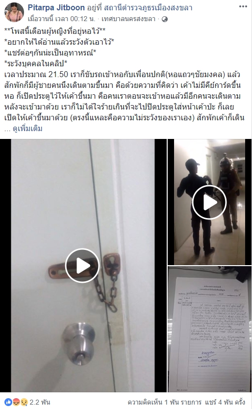 หลังจากเมื่อวานนี้(18/09/61)ทีมข่าวหาดใหญ่โฟกัสนำเสนอเรื่องราวที่เกิดขึ้นในพื้นที่ของจ.สงขลา เตือนภัยผู้หญิงที่อาศัยอยู่หอพัก หลังจากมีชายเดินตามเข้าหอพักหมายจะเข้าห้องด้วย! ตรวจพบมีปัสสาวะม่วง โดยผู้ใช้เฟซบุ๊กรายหนึ่งชื่อ Pitarpa Jitboon ได้โพสต์คลิปเหตุการณ์ดังกล่าวพร้อมข้อความบรรยายถึงเรื่องราวที่เกิดขึ้น