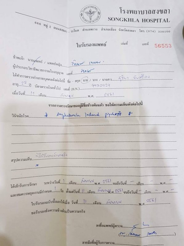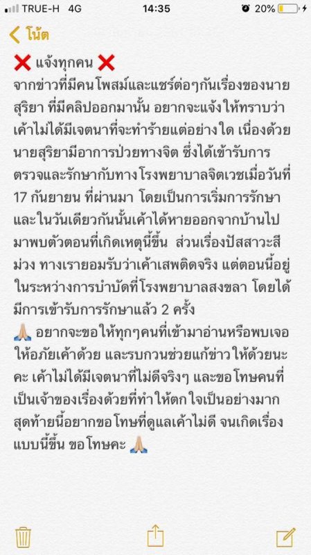 และมีผู้ใช้เฟซบุ๊กรายหนึ่งที่คาดว่าจะเป็นภรรยาของชายคนที่อยู่ในคลิปออกมาโพสต์ถึงเรื่องราวที่เกิดขึ้น พร้อมหลักฐานว่าชายคนดังกล่าวมีอาการป่วยทางจิตและกำลังอยู่ในระหว่างการรักษา และเคยเสพยาเสพติดจริง ๆ แต่อยู่ในขั้นตอนของการบำบัดเช่นกัน จึงวอนให้เข้าใจและให้อภัยชายคนดังกล่าว